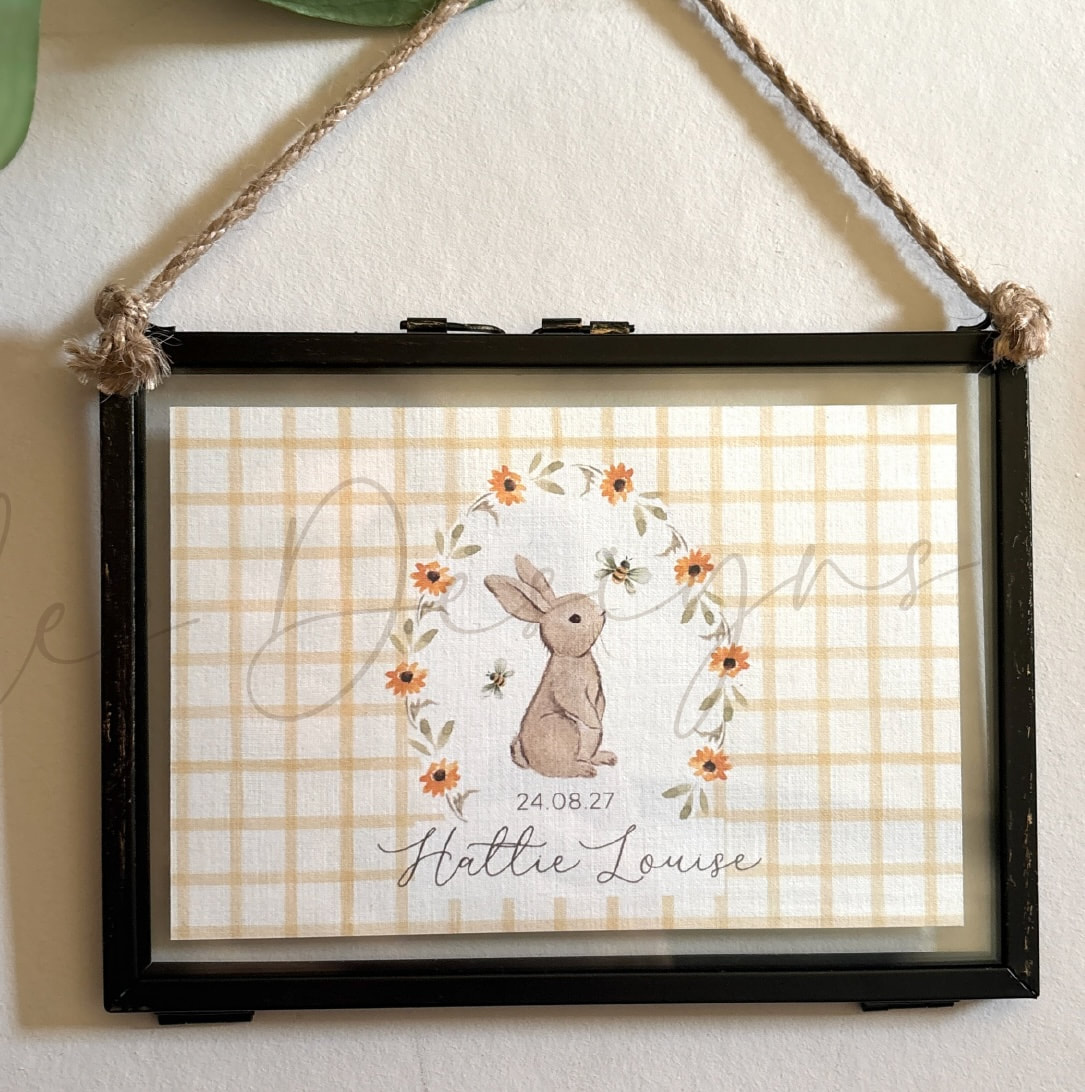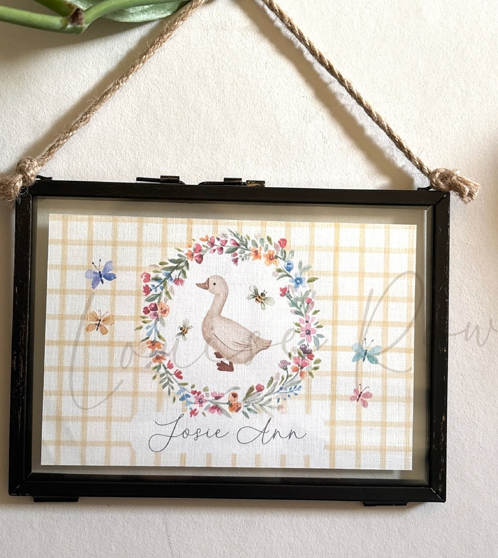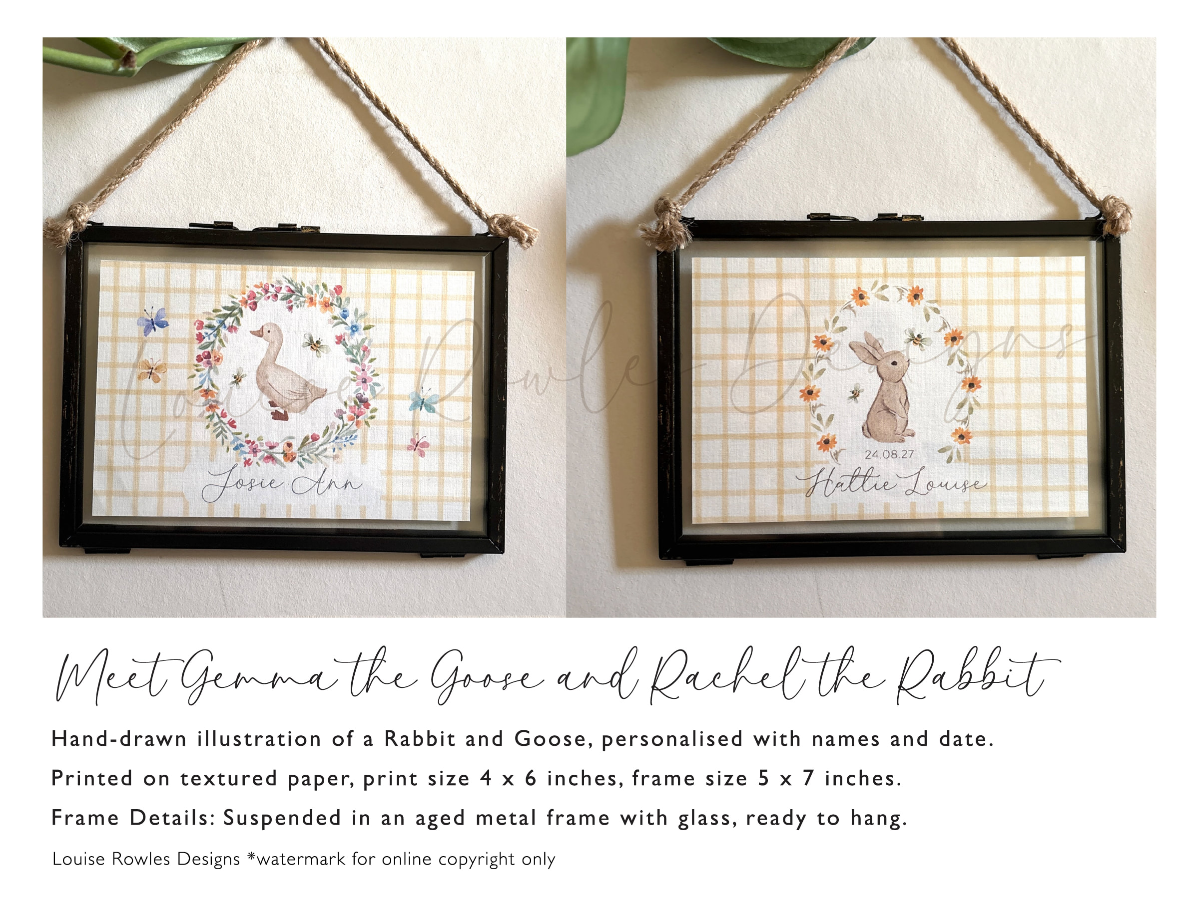 Hand-painted illustration of my vintage Goose & Rabbit, personalised with names and date.